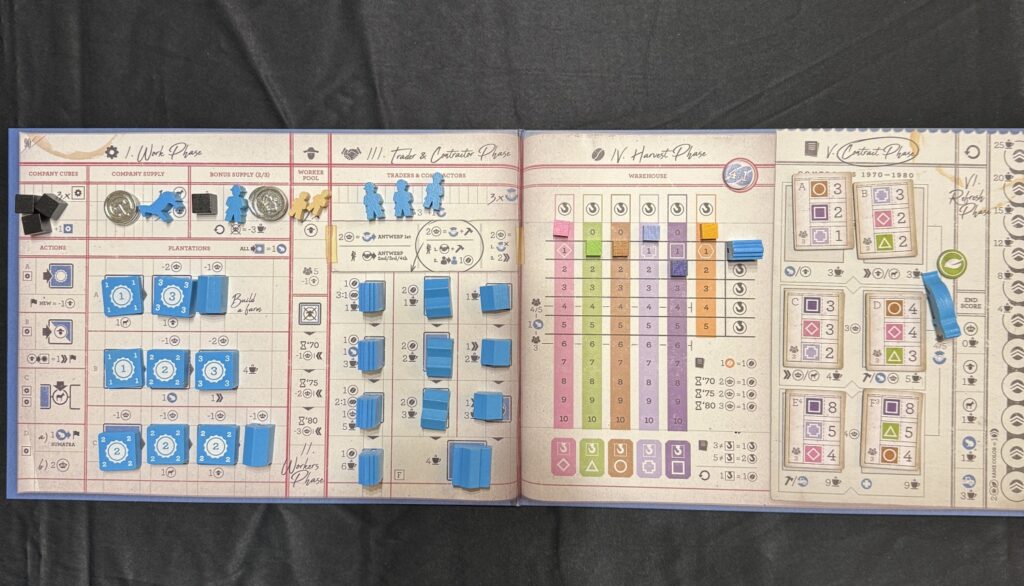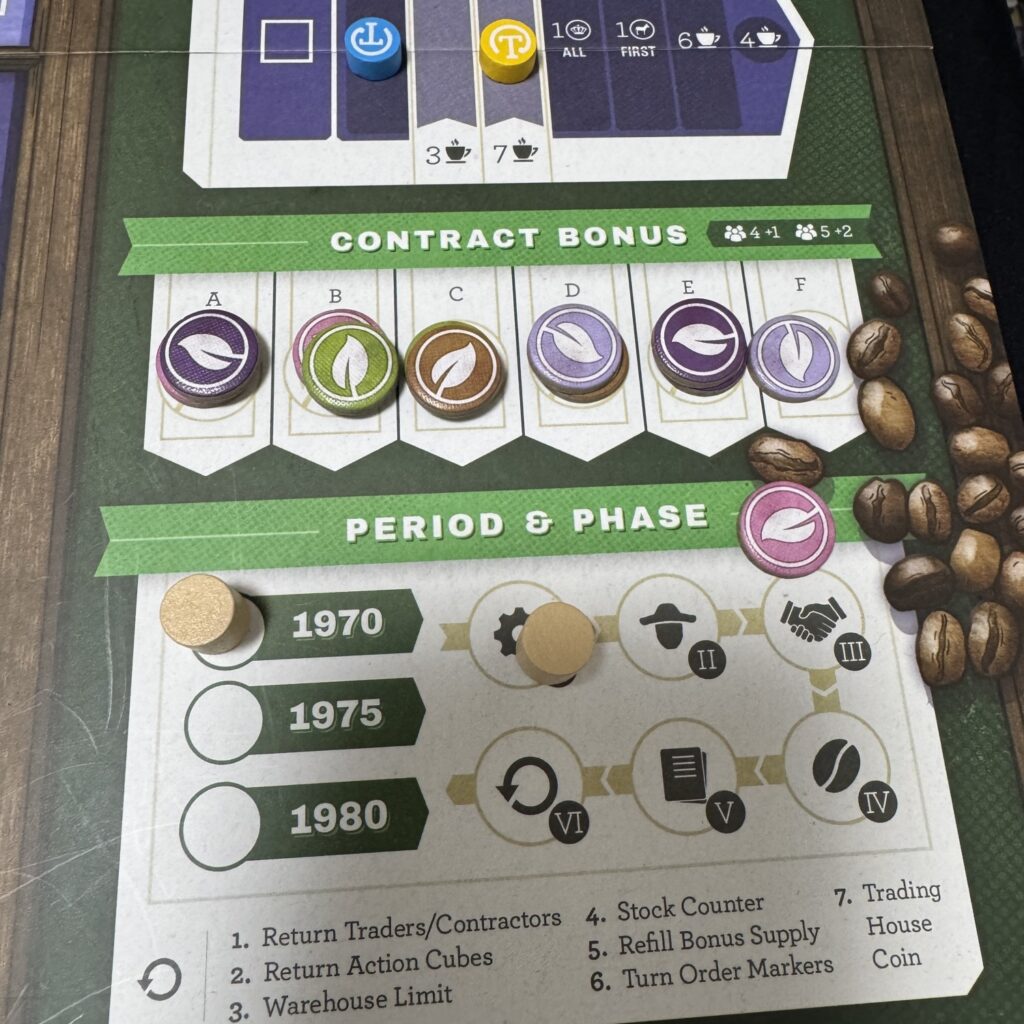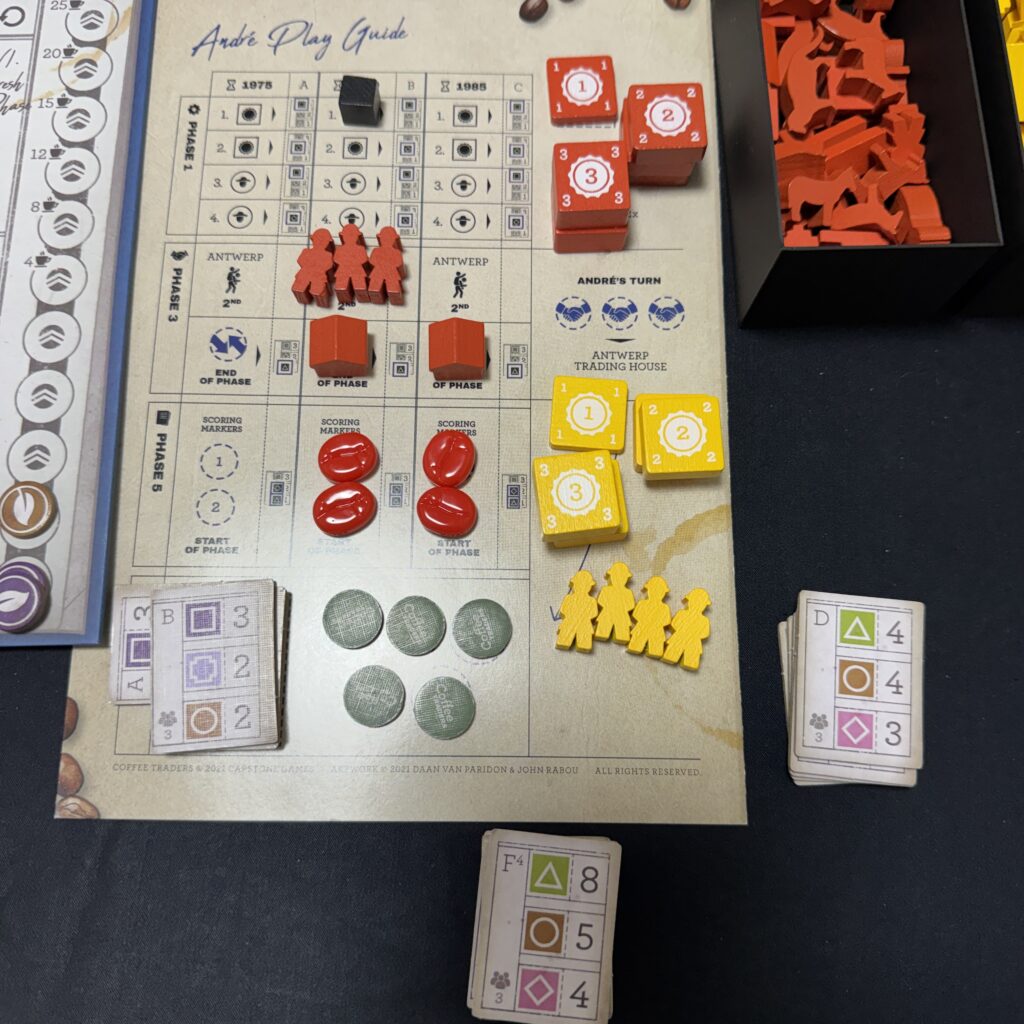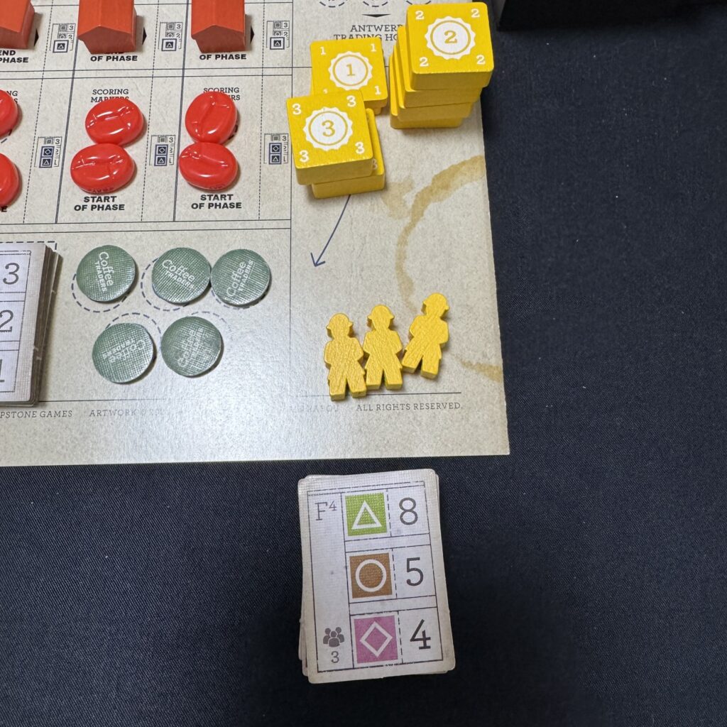 個人ボードのセットアップはこんな感じです。倉庫駒1個を倉庫トラックに配置し、F-契約タイル上の一番上に対応するコーヒーを2つ、真ん中の一番下に対応するコーヒーを倉庫トラック上で1つずつ増加させます。