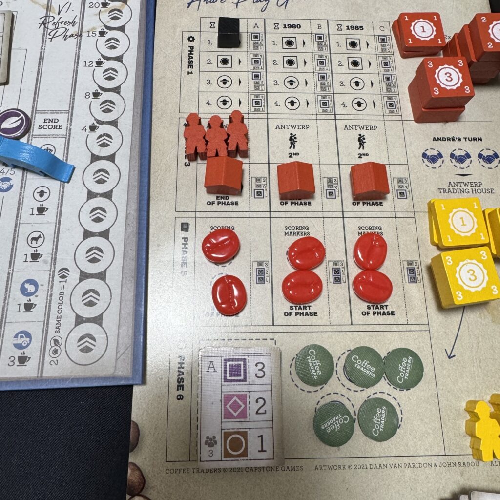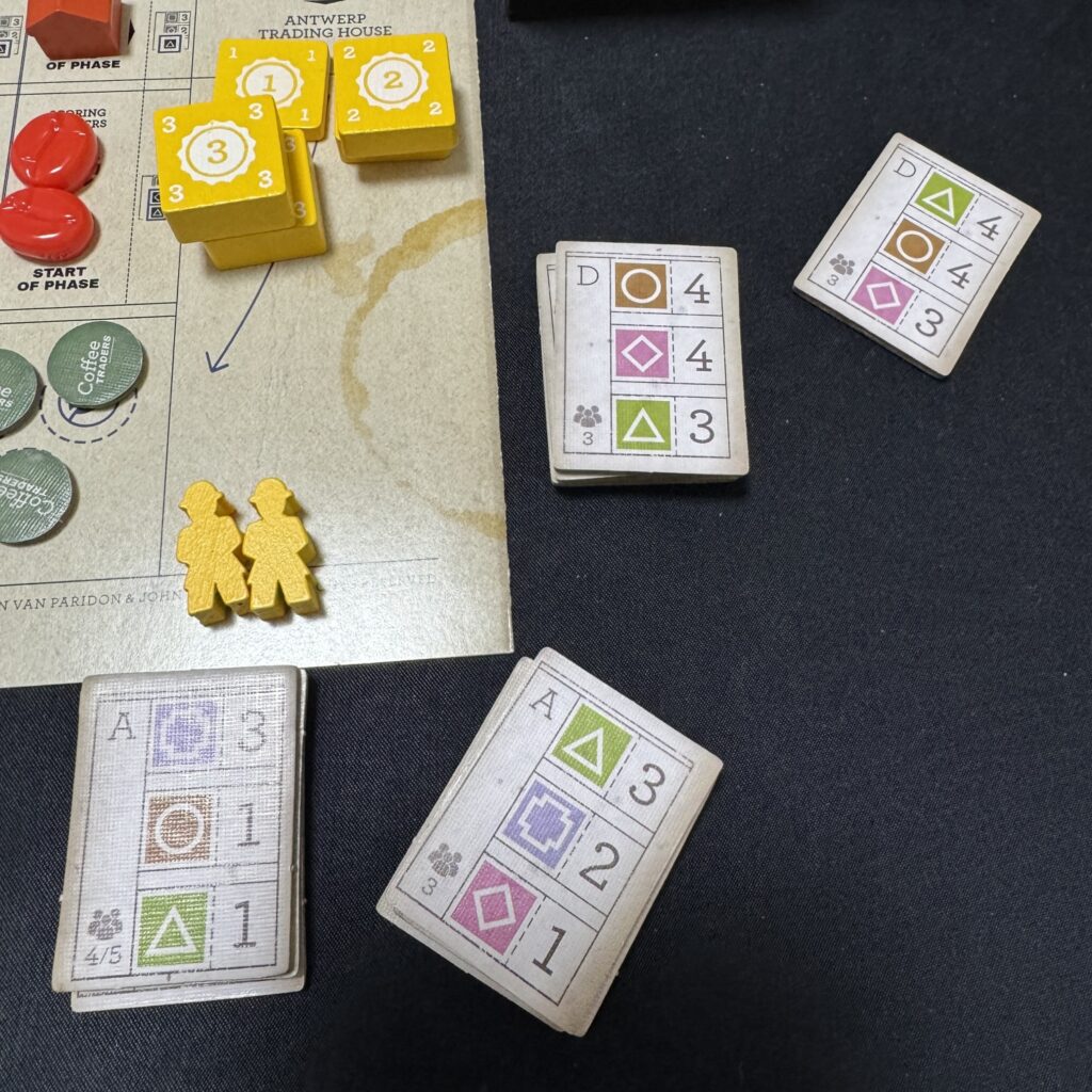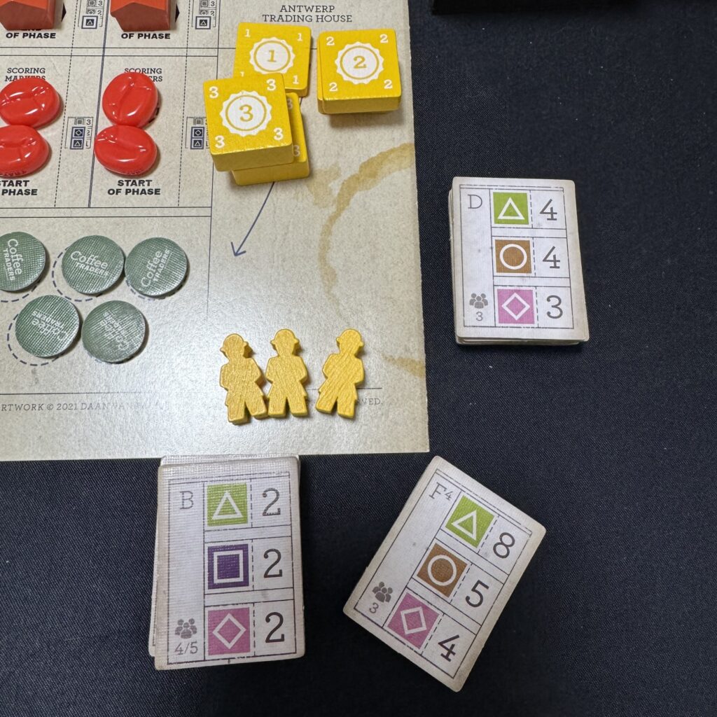 一方、アンドレの手番ではアンドレの個人ボードの下に裏向きで配置してあるアラビカカウンターのうち1枚をめくり、アラビカカウンターに対応した協同組合の商社にアンドレの貿易商駒の配置します。