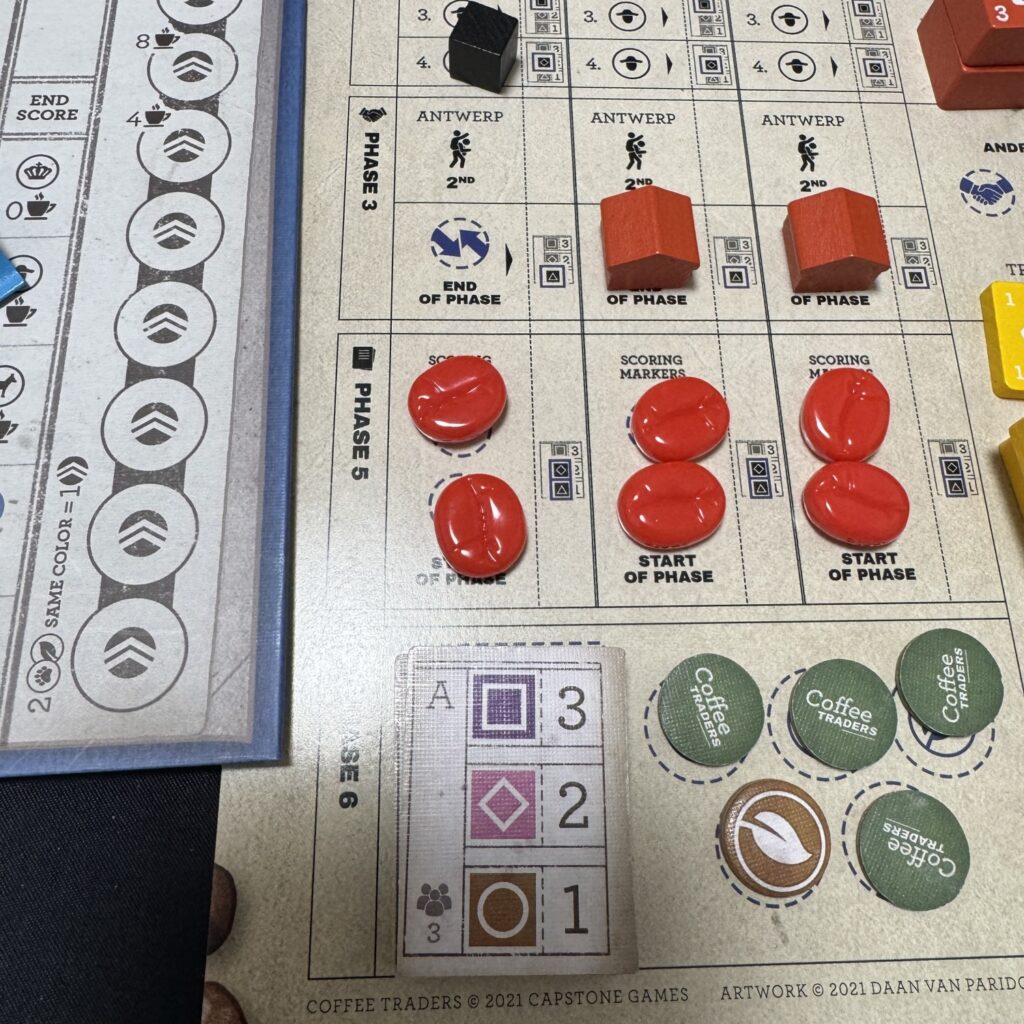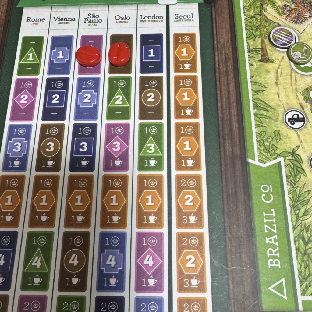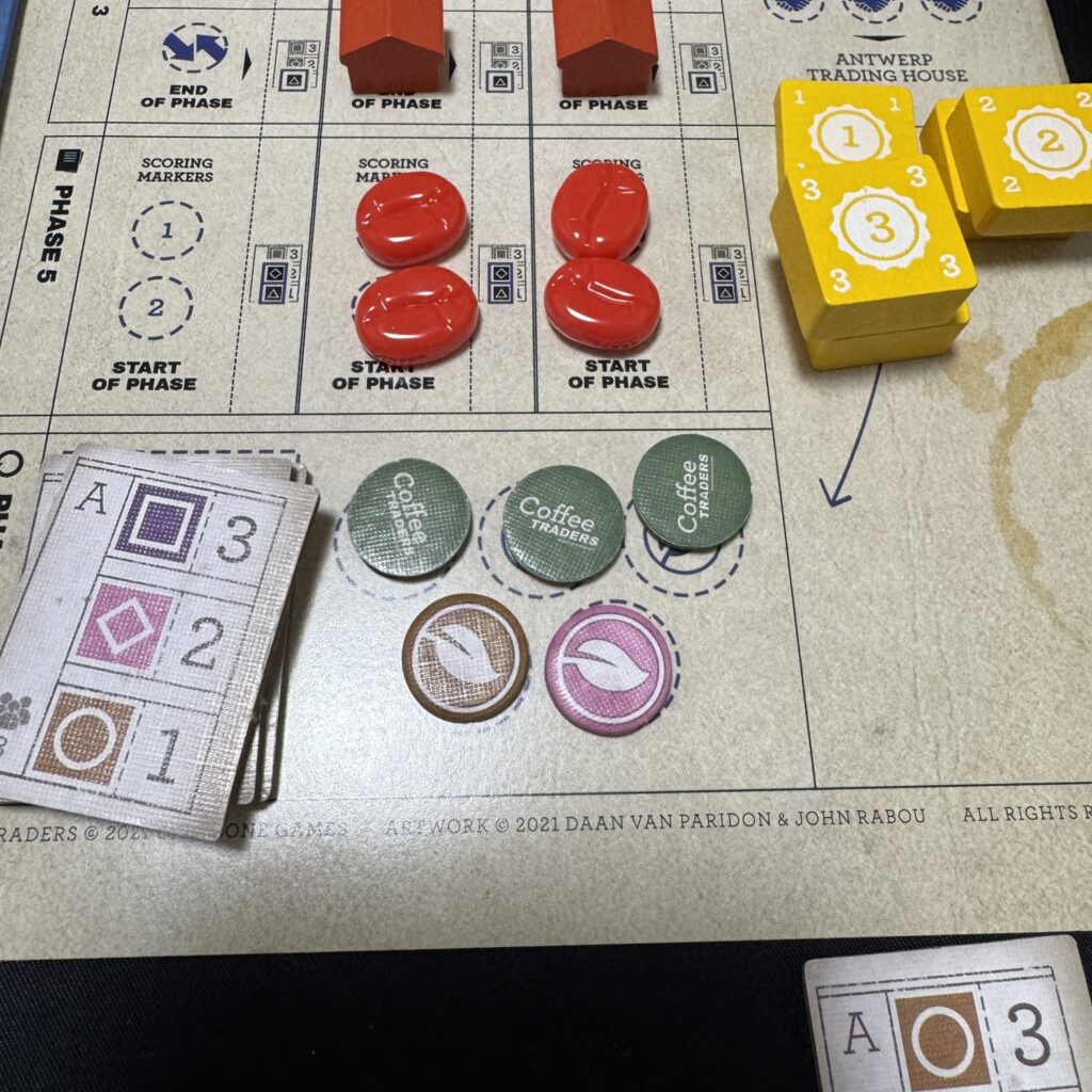 アンドレは、行動カードの二番目及び三番目の協同組合を確認し、対応するコーヒーをコーヒバーに輸送します。下記画像では、二番目が◇(グアテマラ)で、三番目が◯(インドネシア)がだったため、それぞれに対応するコーヒー場に得点マーカーを配置します。