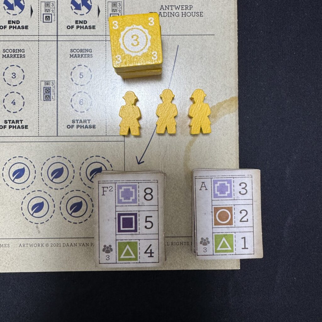 3・4手番では、A-契約タイルに示された3つの協同組合のうち、一番上及び真ん中の協同組合に労働者駒を配置します。配置方法はプレイヤーの行うアクションBと同様です。